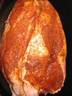 2. Thoroughly coat the pork in the spice rub. (You may have some left over: it’ll be great on any protein.) Wrap up the pork as tightly as possible in plastic wrap and put in the fridge anywhere from three hours to a full day. The longer you leave it, the more the spices will infuse into the meat.
