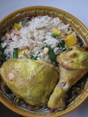 I have a seriously awesome husband. Since we found out that we’re expecting a little foodNURDling in December my moods and energy have fluctuated a lot and he’s rolled with the punches (metaphorical punches, to be clear…my mood swings aren’t that intense!). I’m often too tired to cook, to clean, to make it past 9:30pm without a nap. So, to thank him for picking up the slack, I headed off to Kensington to pick up some delicious, fresh ingredients for a yummy dinner! This is Tyler Florence’s recipe, as is the mango-basmati rice with which it’s served. This recipe calls for a chicken in 10 pieces: if you go to the butcher, they will be happy to do this for you! You can also get chickens broken down at the grocery store…or you can try it at home yourself.