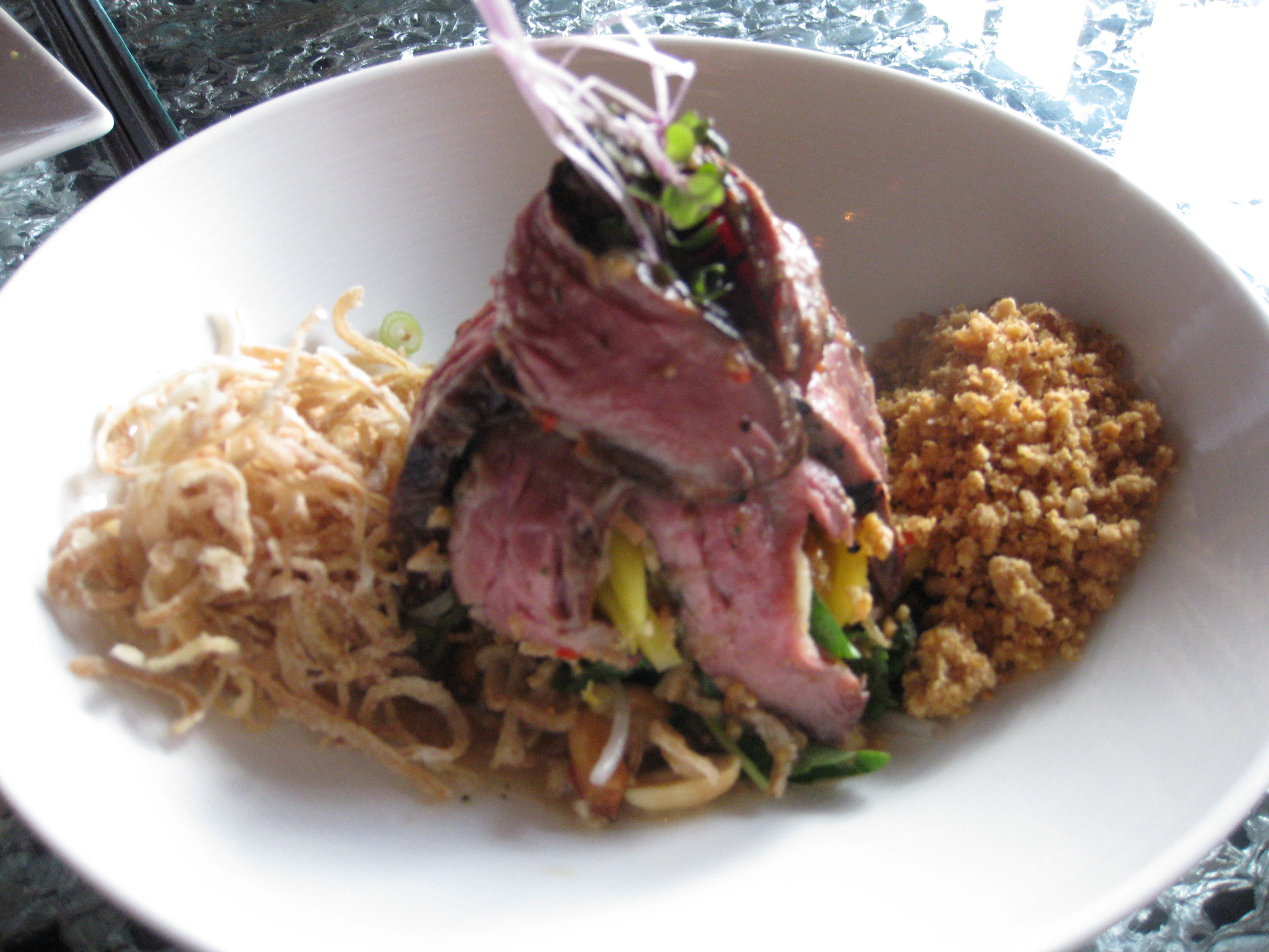 When the bread basket arrived at the table after placing our order, we jumped right in. J loves bread and watching his face light up after taking that first bite of the gorgeous Red Fife bread was wonderful! I’d read about this particular grain in Sara Elton’s book, Locavore, and was excited to check it out. It kind of makes regular bread taste entirely pathetic. We both had a couple of pieces of the various kinds when the appetizer arrived. The scallops were soft, the avocado was whipped into a lovely, airy bubble and these textures were complimented well with the crunchy quinoa and cabbage. I wish there’d been more of it, but we weren’t exactly going to starve.