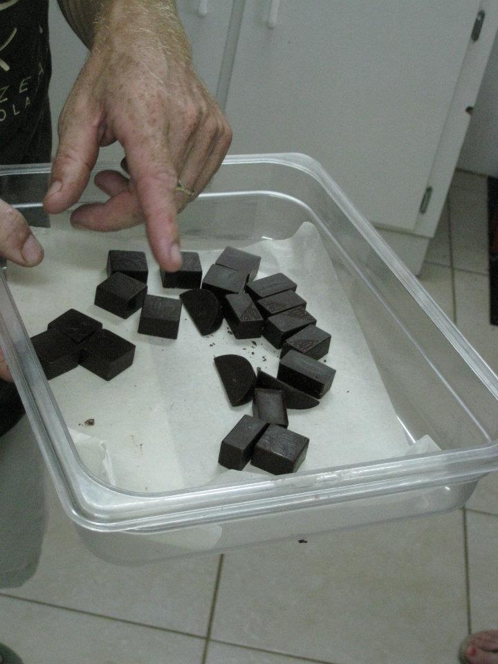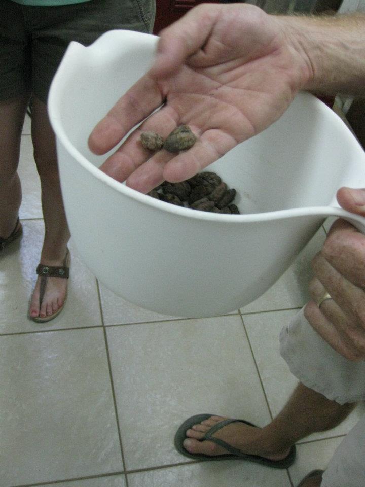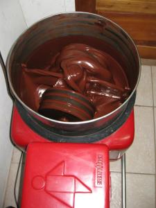 A few other guests joined us and we all headed down to the south end of the island, roughly three miles from the B&B. Orlando, our taxi driver, was very entertaining, pointing out local landmarks and describing the various foliage which could either heal or seriously harm, apparently. We arrived at the Belize Chocolate Company and were greeted by one half of the team, a British ex-pat named Chris Beaumont. (His partner, Jo, works there in the afternoon.) He took us right into his work space and explained the basic chocolate making process. It was all we could do not to dive in greedily as he showed us the raw cocoa beans, the various stages the beans must go through in order to become beautiful, silky chocolate, the just-picked oranges that would be incorporated into some of the chocolate…seriously. It was tough even at 10:30am.