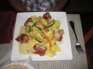 Next up: snapper fillet with Caribbean garlic-cilantro mojo, served with coconut rice and  wilted spinach and bacon-wrapped scallops with a maple cream sauce on a bed of pappardelle pasta and julienned zucchini and carrots Bacon-anything usually gets my vote as is, but wrapped around scallops and served over fresh pasta with a sweet maple cream? Oh my, yes. Really, this was a stellar meal in a beautiful restaurant. If we’d had room, certainly we’d have indulged in dessert but we were pretty full as it was. Shame, really, as the rum-glazed bananas and the trio of crème brulée looked fantastic.