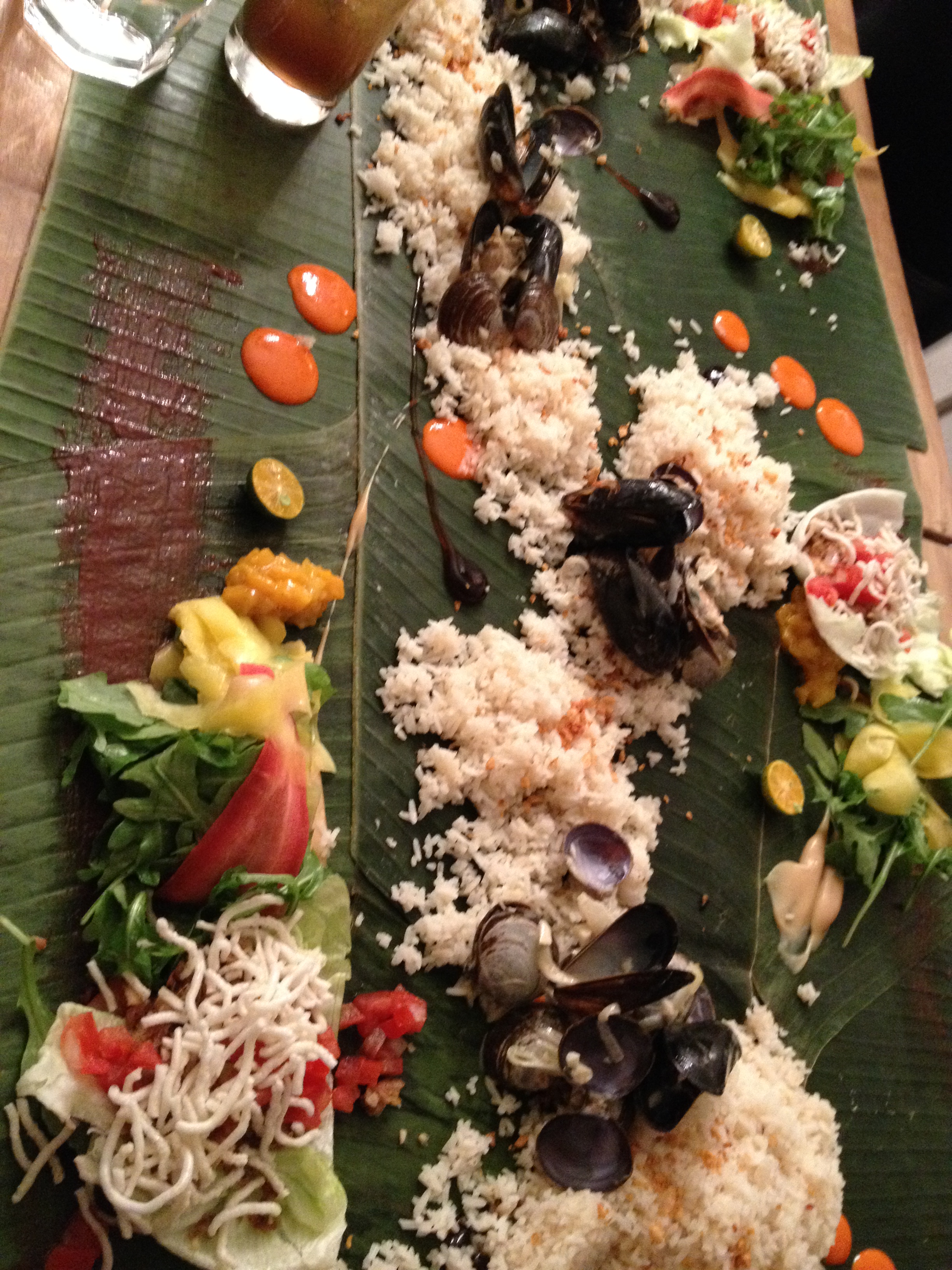 Any chance I get, I love to eat my food with my hands. Bacon? I eat with my hands. Scrambled eggs? Piled on toast and eaten with my hands. I have been known to eat gooey, rich chocolate cake with my hands and no one can convince me otherwise that it doesn’t make for a more joyful experience. (You people and your cutlery-for-pizza ways? I do not understand you.) So when I was invited to take part in a kamayan dinner at Lamesa last night, I was genuinely excited. Sitting down at a table draped with banana leaves and eventually adorned with brightly coloured, intensely flavoured food is my idea of a great dinner. Every Sunday, Lamesa is offering this kamayan (translated, means “hand to mouth”) dinner for a very reasonable $40/person that would be great for everyone: a group of friends, a family, a date. Best to make reservations and to know that this is not a fast meal: the idea is to sit with those you care about to share and enjoy a meal together. It’s a Filipino tradition that the owners and chefs want to bring to our awesome city and I think it’s a fabulous addition. It’s a feast for the senses.