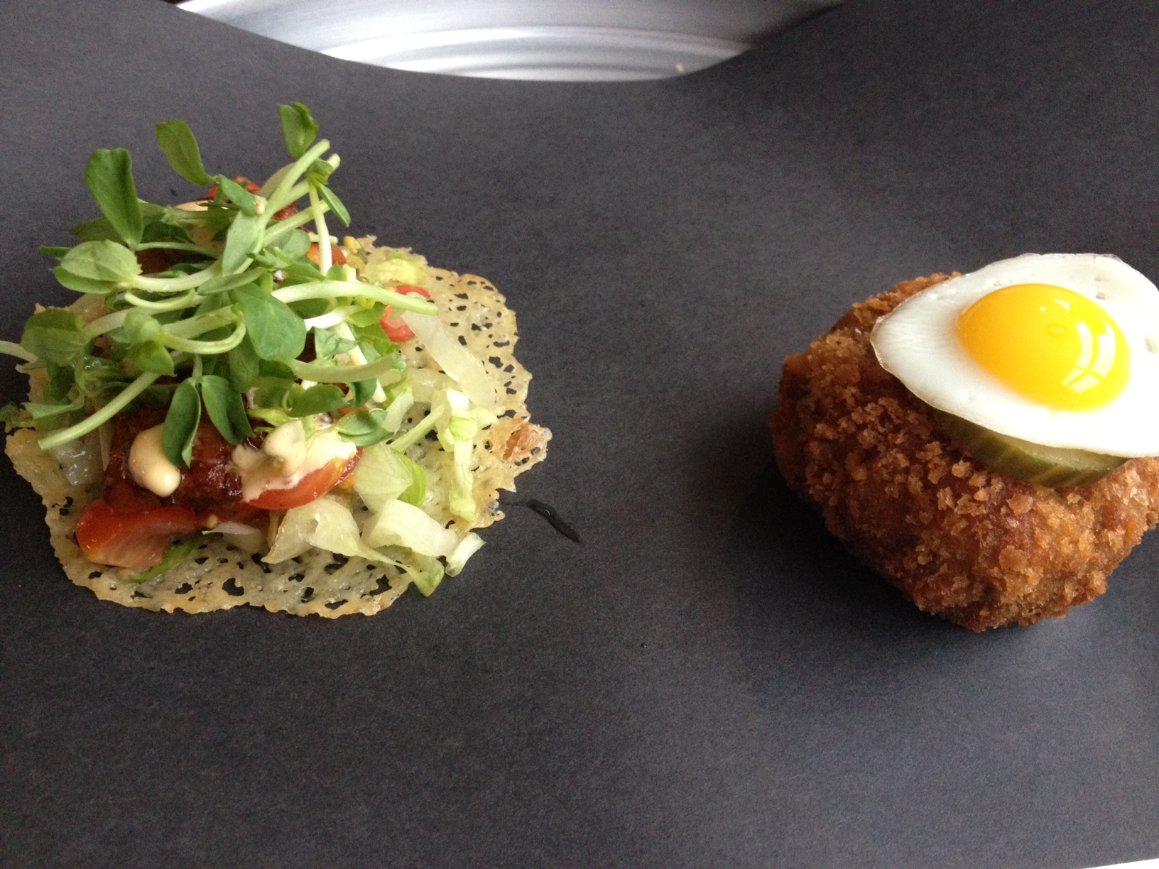 Next up, plate two: the deep-fried cheeseburger topped with a pickle and poached quail egg and Lisa Marie’s take on a BLT – the “pork belly cheese thang.”