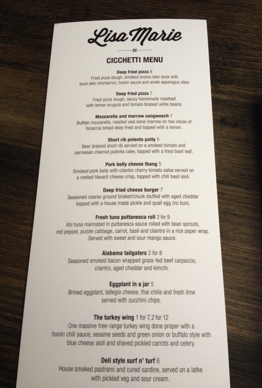 Matt Basile can fairly be called a bundle of energy. In less than two years, he has gone from tables at 99 Sudbury to pop-up events around the city to owning a food truck to opening a restaurant. Oh, and let’s not forget shooting a TV show for Travel & Escape, documenting this whirlwind. You knew Matt, a.k.a. Fidel Gastro, was at an event when you heard the boisterous cries of, “OLÉ!” and when you spotted the omnipresent Elvis bust. Between his enthusiasm and his tasty sandwiches, it is no surprise that Matt has fast-tracked his way to opening his restaurant, Lisa Marie (638 Queen St. West). The menu is comprised of cichetti – small dishes enabling you to try lots of options – and a couple of specials. I went with two equally hungry friends and we decided to order the entire menu, plus one of the specials as it sounded too good to resist. We asked our waiter, Chris, if we were being too ambitious; he asked us to put our trust in him and told us he’d take care of us. If we were getting too full, just let him know and we’d skip right to the special.