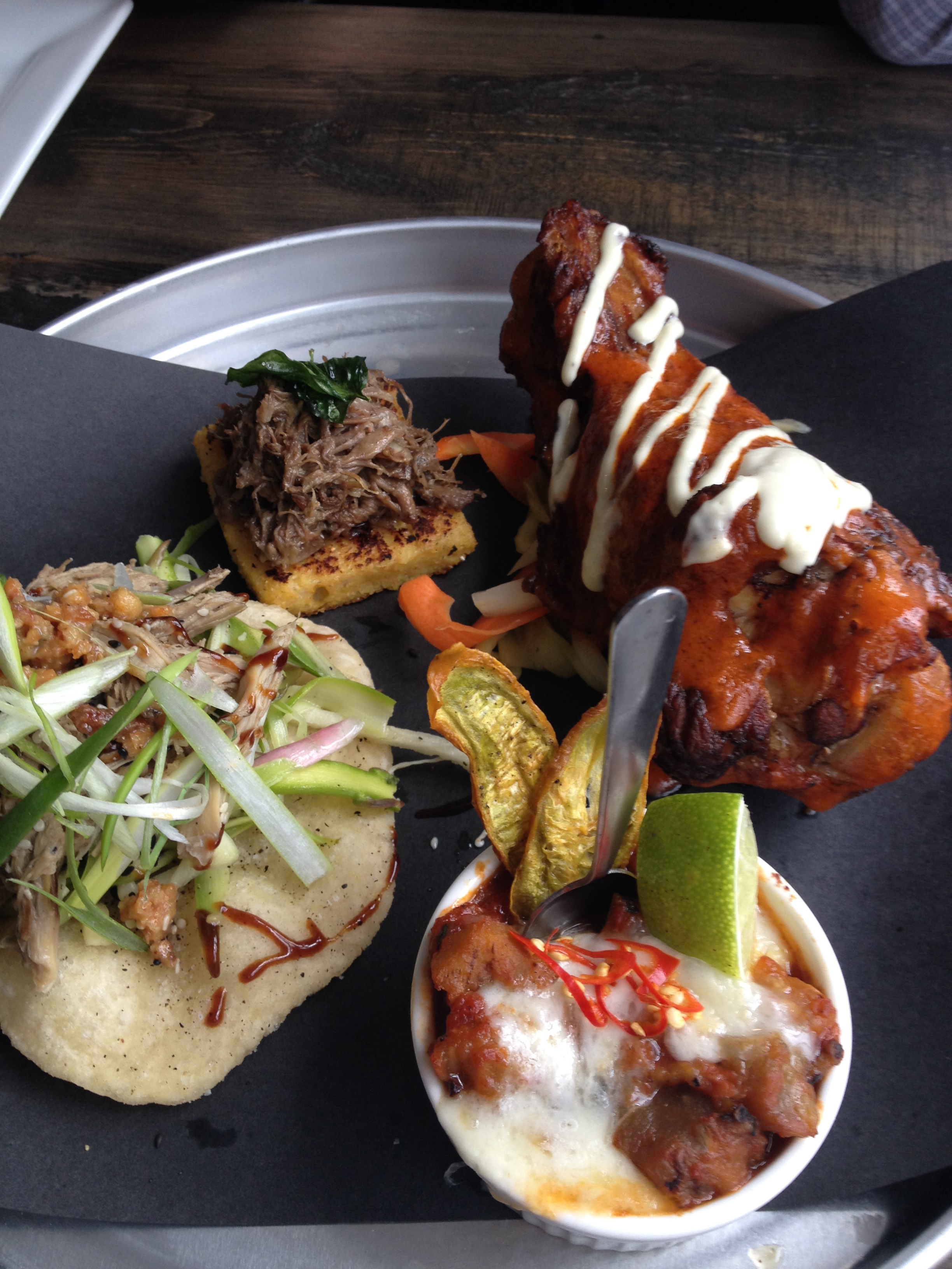 The first round of food consisted of: beer-braised short rib on polenta, brined eggplant with tallegio cheese and chili peppers, the (MASSIVE) turkey wing done in a buffalo style and the deep fried pizza with smoked duck and enoki mushroom and asparagus slaw.
