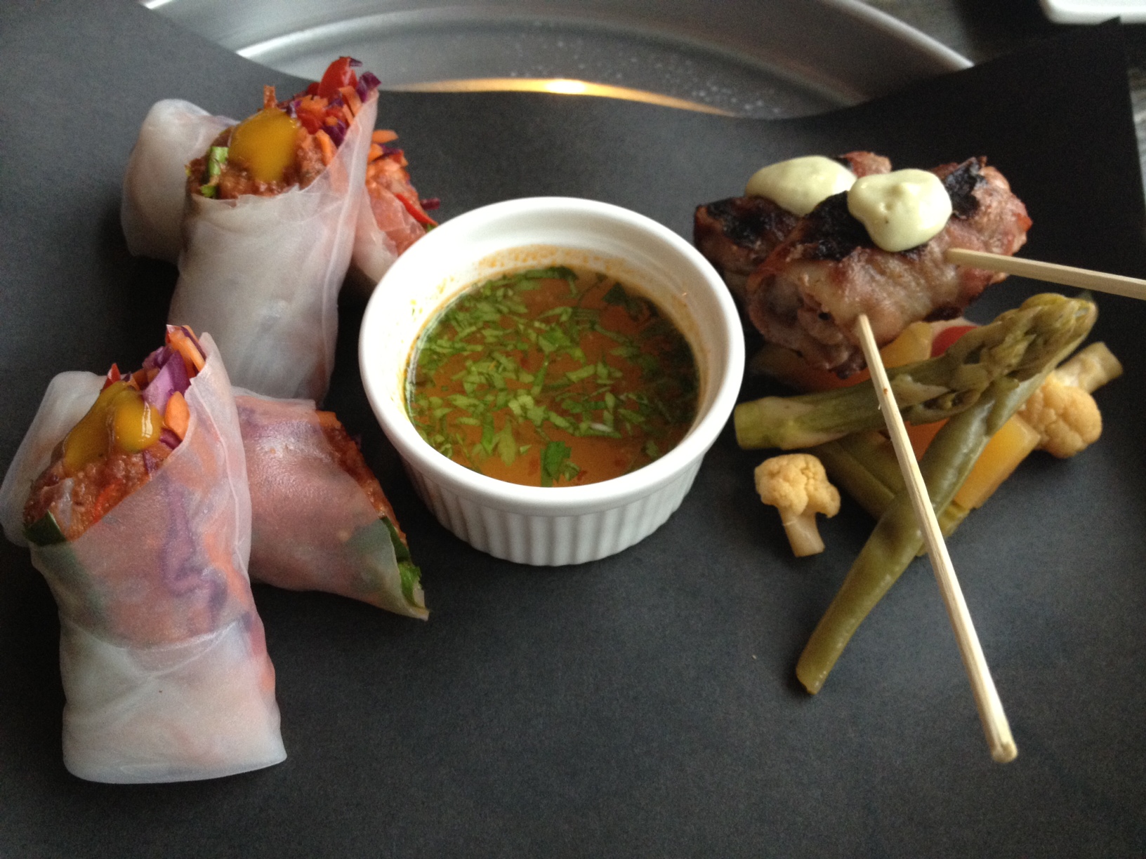 On the left is the fresh puttanesca tuna roll: ahi tuna marinated in a puttanesca sauce and rolled up in rice paper with a variety of fresh vegetables. Crunchy, light and full of flavour, the rolls are finished with a sweet and sour mango sauce. This sauce was so good one of my tablemates drank the whole thing.