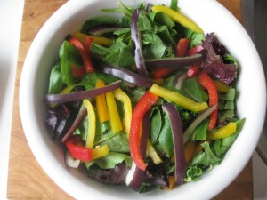 I had some chicken thighs, some potatoes, sweet peppers and cherry tomatoes. I didn’t want to make a lot of dishes, so on to a large roasting sheet they were to go. In a large bowl, I made a quick marinade with olive oil, paprika, thyme, garlic, salt and pepper and tossed in the chicken and halved new potatoes. In went the potatoes into a hot oven, followed by the chicken and finally the peppers and tomatoes (with just a little salt, pepper and olive oil). Forty-five minutes later I have moist, aromatic chicken, beautifully roasted potatoes that are creamy on the inside and crispy on the outside, and lovely, caramelized vegetables. There was almost no prep work and minimal clean up: perfect!