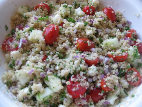 2. Boil 4 cups of salted water and add the quinoa. Cook 10-15 minutes, until the quinoa is tender. Add in the onion and cook an additional minute. Drain and let stand 15 minutes. Fluff with a fork, transfer to a bowl and allow to cool.